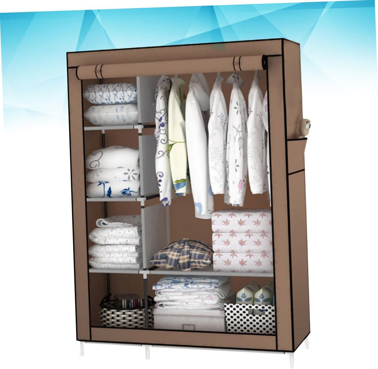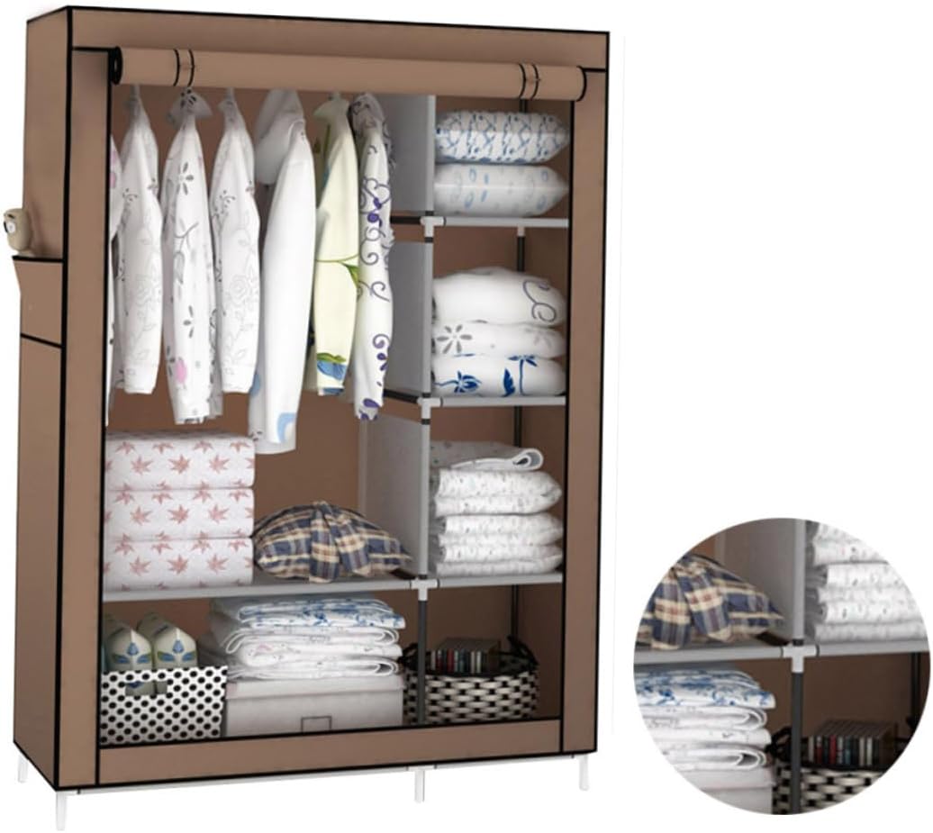 Package Include 1 x fabric closet storage Features - Material: Fabric and metal fabric closet storage. - Size: 170 x 105 x 45 cm portable closet for hanging clothes. - Color: Coffee fabric closet organizer. - Movable and convenient portable wardrobe closet. - Suitable for home/dormitory/rent house, etc fabric closet with shelf. - Including haning space and shelves space with large capacity. - Sturdy, , dampproof, with prevention. - Combined with fabric cover, metal tubes and plastic joints, not difficult to assemble.Goods Descriptionfabric closet storage Made of materials, sturdy, , dampproof, with prevention.portable closet for hanging clothes Combined with fabric cover, metal tubes and plastic joints, not difficult to assemble.portable wardrobe closet Suitable for home/dormitory/rent house or anywhere you might need.fabric closet with shelf This portable closet is movable, convenient for you to use.fabric closet organizer It includes hanging space and shelves space to meet your needs with large capacity lot of clothes